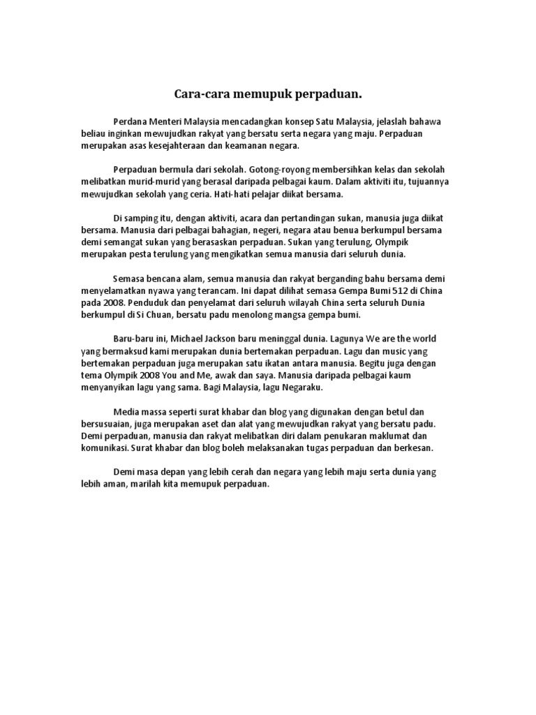 Contoh karangan perpaduan kaum bahasa melayu terbaik bagi pt3 spm stpm berikan pendapat mengenai kepentingan dan semangat di malaysia. Cara-cara memupuk perpaduan di Malaysia. Langkah-langkah mengekalkan perpaduan di negara.